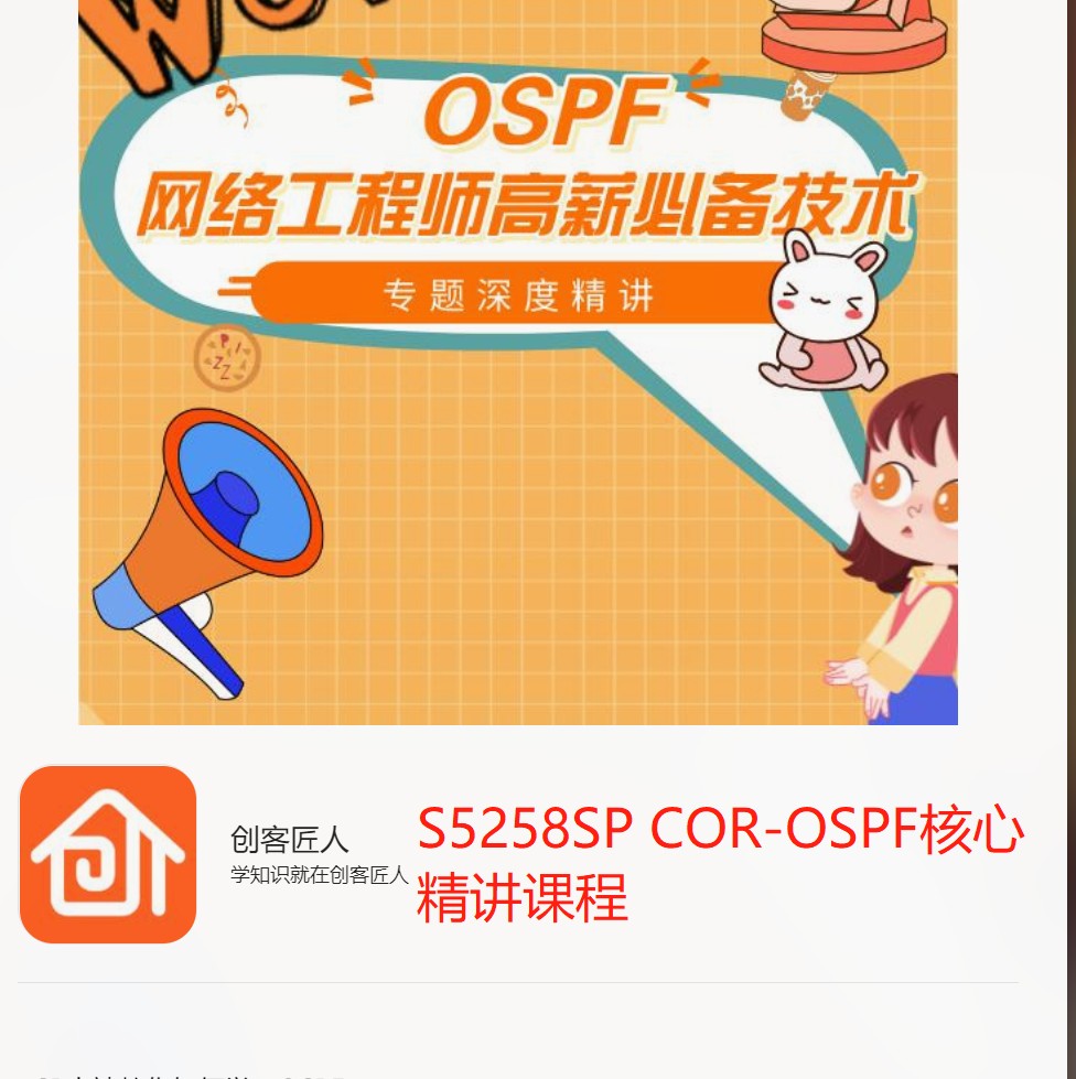 【35[红包]·S5258SP COR-OSPF核心精讲课程】 ●汪星球搜索下单 ●赏金猎人50%分佣 内容看图,或者汪星球搜索 1580《S5258SP COR-OSPF核心精讲课程》 捐赠35[红包],即可获得学习权限 会员、代理、合伙人可通过汪星球右上角专属链接返佣