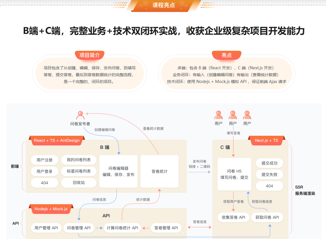 接触过几千名前端学员,发现大部分学员只用过 Vue,但 React 在大厂的使用率非常高,不会 React 降低学员在工作、面试中的竞争力。本课由双越慕课明星讲师,运用擅长的通俗易懂的讲课方式,从入门、进阶到实战,帮助你系统构建完整的 最新React 生态技术体系,手把手带领下完成一个超2W行的高质量复杂低代码项目-高仿问卷星,从架构到拆解,从B 端到C端,完整业务+技术双闭环实战,助你在激烈的竞争中脱影而出。