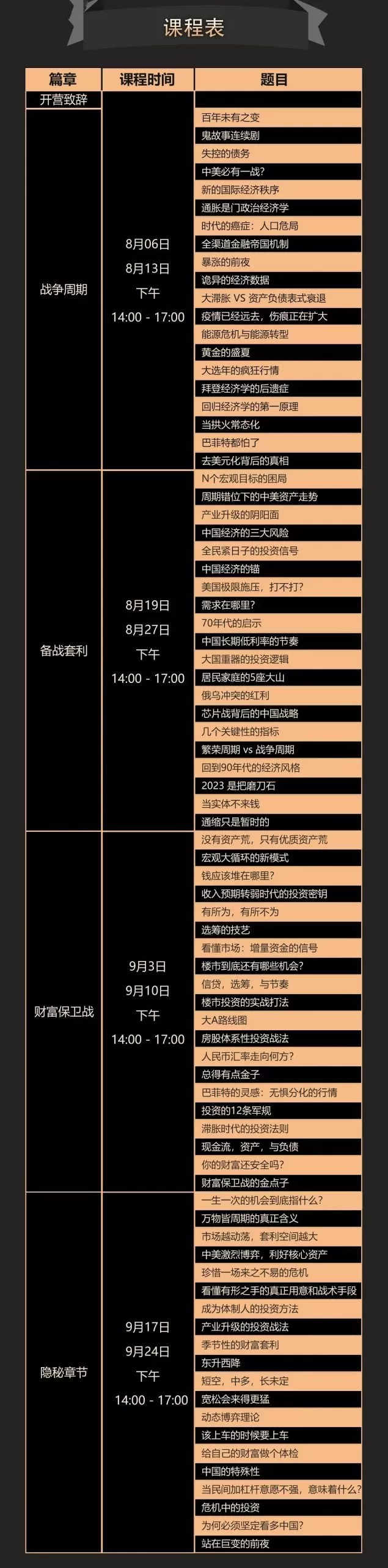 8月6日开营,9月24日闭营,总共8个半天。本期训练营为2023年度【A视野】唯一一次集中授课训练营,内容涵盖总共4个篇章,80个重要主题,A森亲自授课。