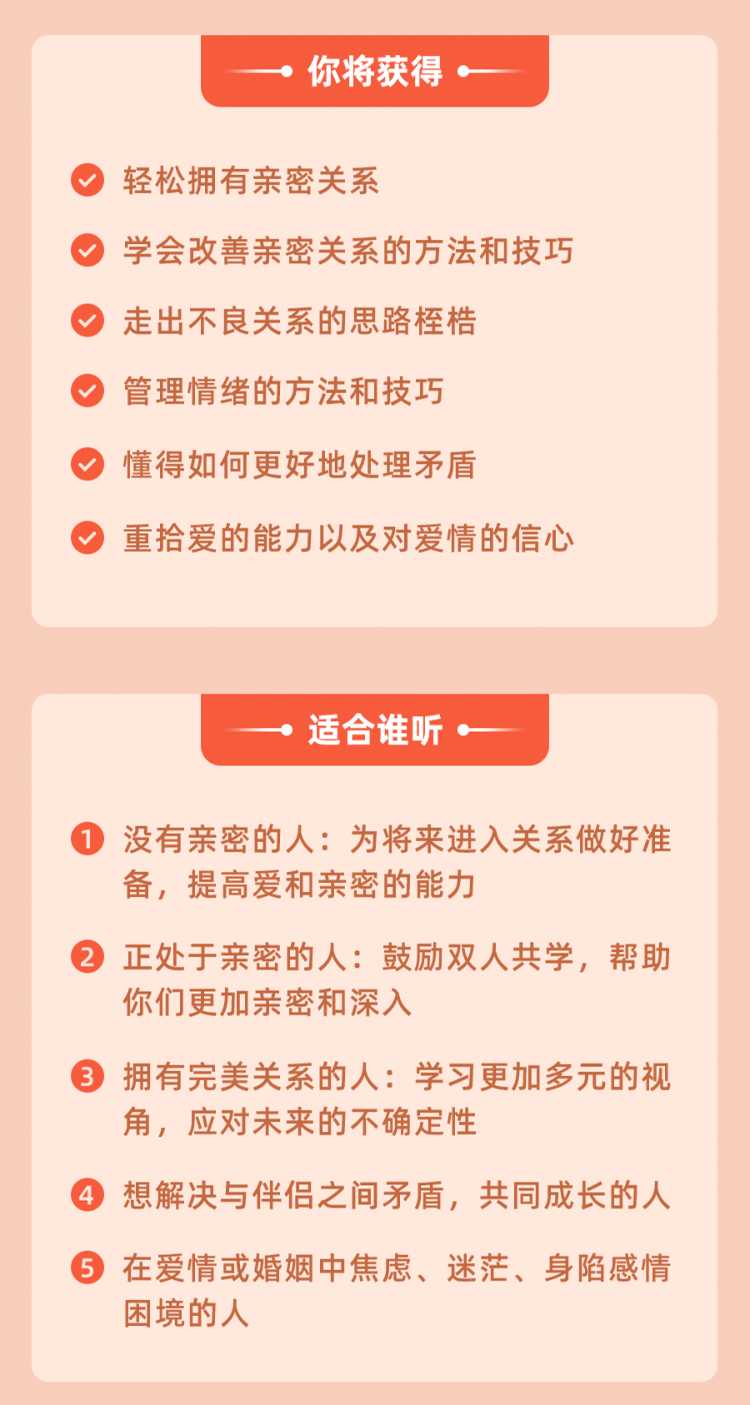 亲密关系是我们每个人的软肋,我们越是渴望被爱越是容易受伤,本课程教你提高亲密的能力,为你打开新世界大门,覆盖90%亲密关系场景,50+真实案例分析,100+知识点,帮你换个角度看问题,化解陈年关系困局。