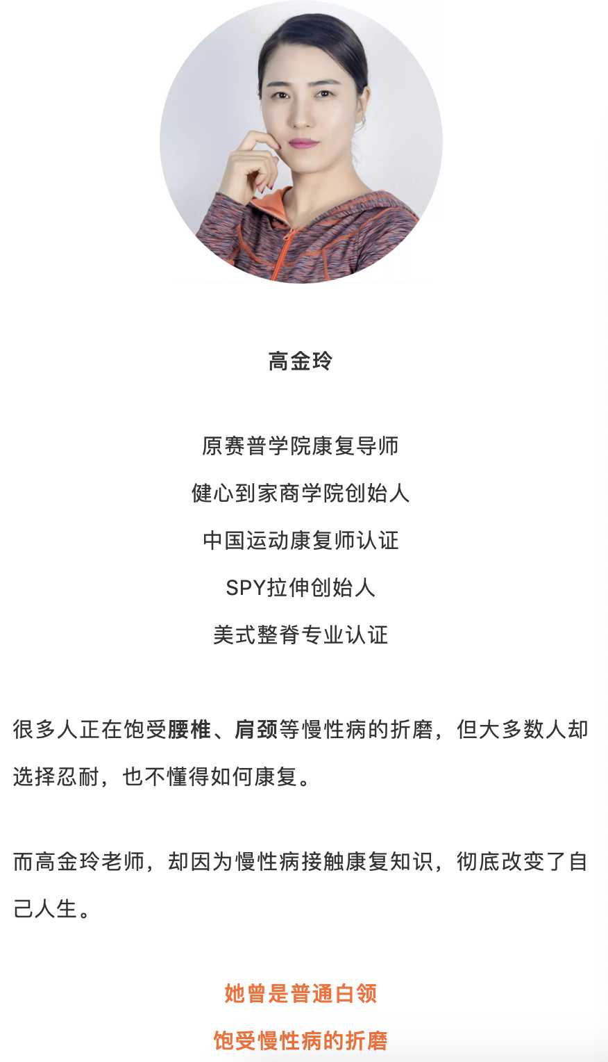 高金玲,她从饱受慢性病折磨的白领到知名康复导师,总结出了一套有效的“腰椎间盘突出康复系统训练”。