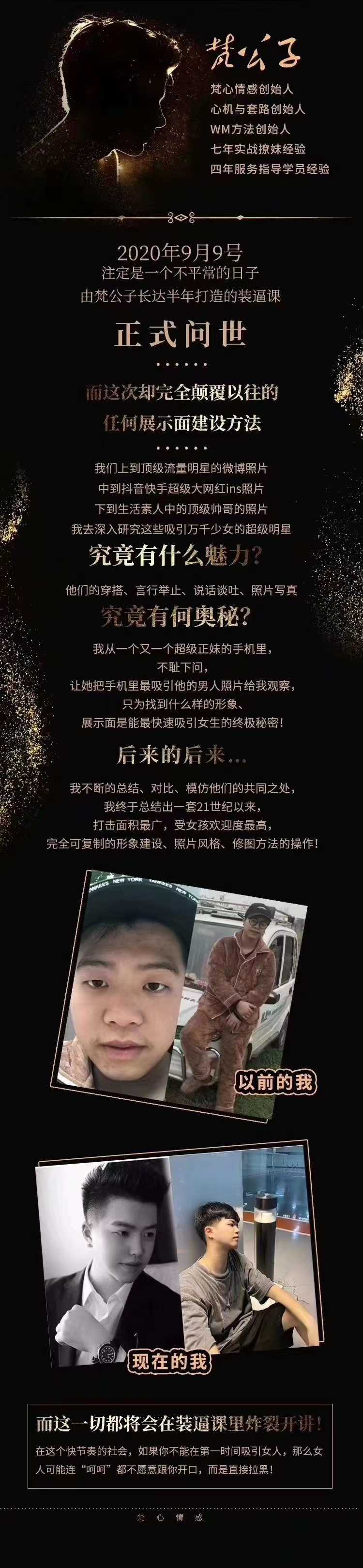 《梵公子装逼课》:这是一个解决你妹子资源和吸引女生的核武器,他的厉害之处在于,你花了最低的成本,而吸引到了最漂亮的女生!如果用一句话概括这个服务会教会你什么?那将是:“让女孩看到你真人或朋友圈照片的第一眼,就忍不住想要找你聊天”!