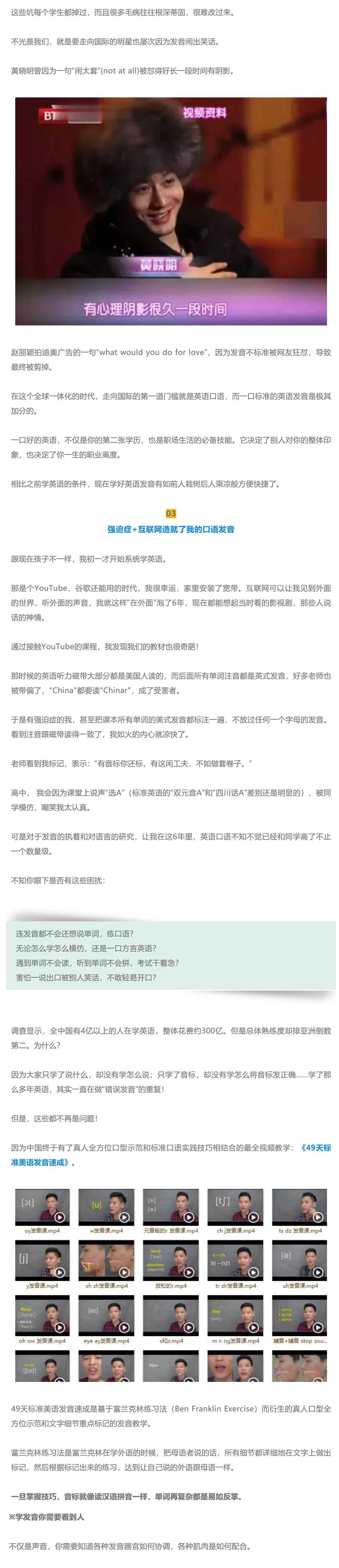 49天标准美语发音速成是基于富兰克林练习法(Ben Franklin Exercise)而衍生的真人口型全方位示范和文字细节重点标记的发音教学。
