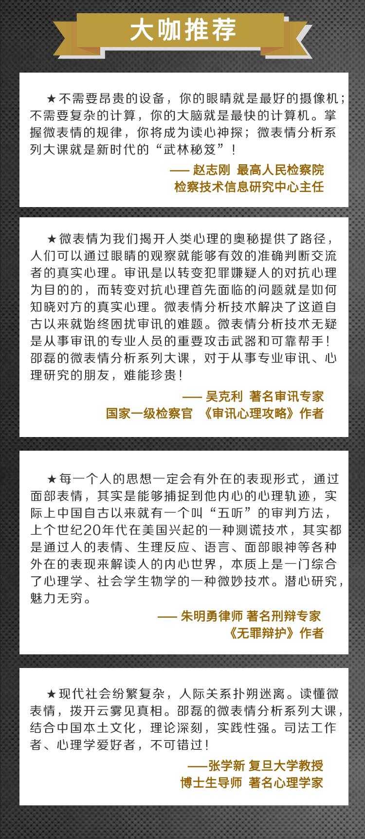拥有一线刑侦经验的微表情分析专家邵磊,用60节专业实战课程,带你直抵人心,掌握读懂人心的秘籍。