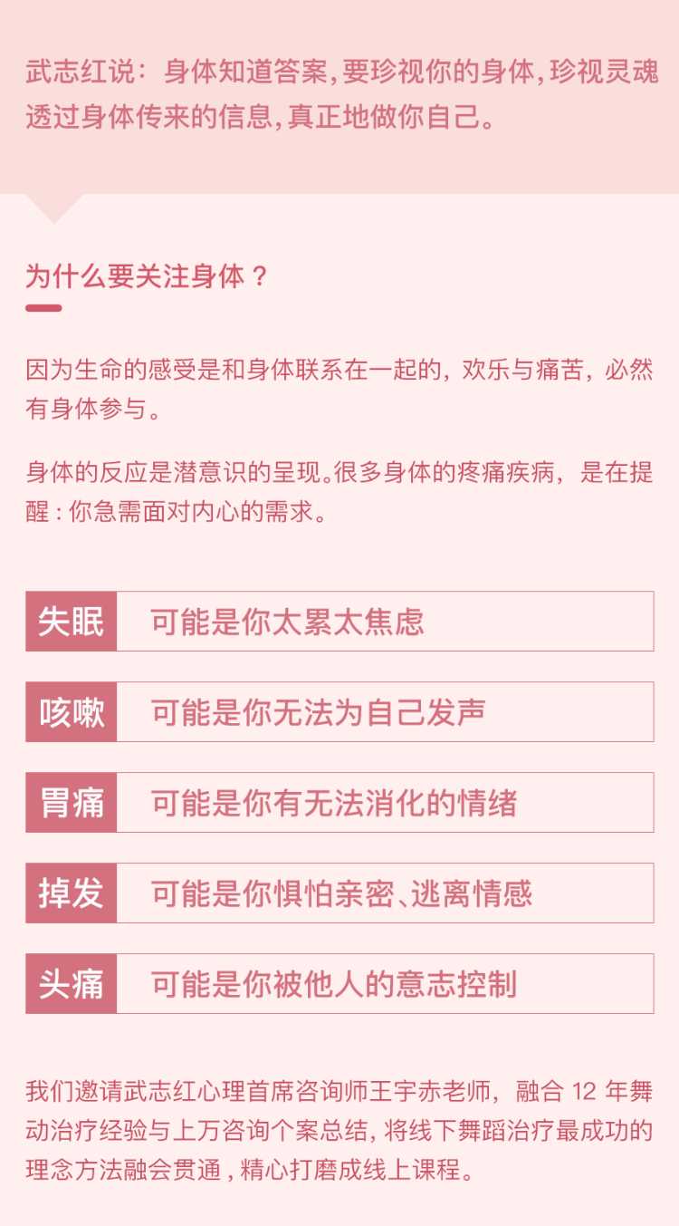 身体的反应是潜意识的呈现。很多身体的疼痛疾病,是在提醒:你急需面对内心的需求。