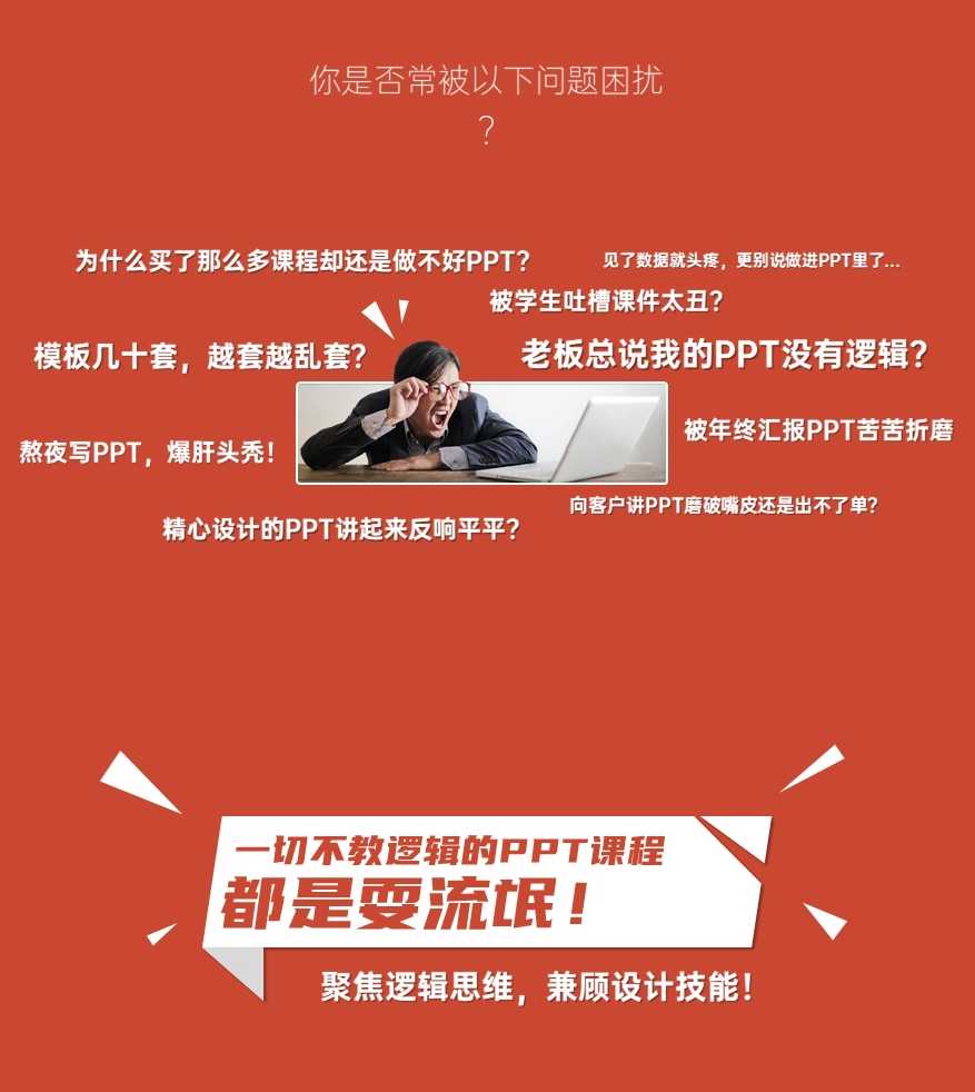 课程里涵盖了逻辑提升课,经验分享课,思维实战课,设计技能课,专业提升课,操作示范课,共6大类型,34节课。无论你是PPT初学者还是高端设计师,无论是职场萌新还是创业大佬,这都是一份适合你的PPT万能宝典。适合职场白领,大学生,实习生,设计师,培训讲师,销售代表,创业者,政府人员,数据分析师学习!
