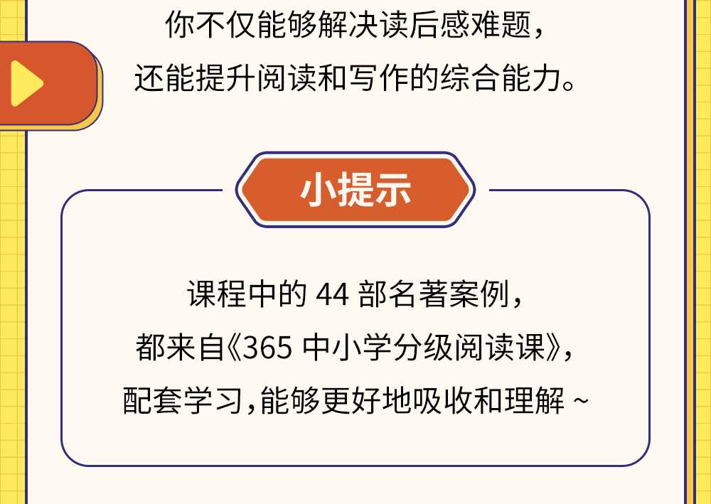 汇总了大家的疑问,袁坚老师特别设计了一套“通关秘籍”,以教育部推荐阅读图书等44部名著为例,教你选角度、架结构、用技巧,一步步升级为读后感写作高手。