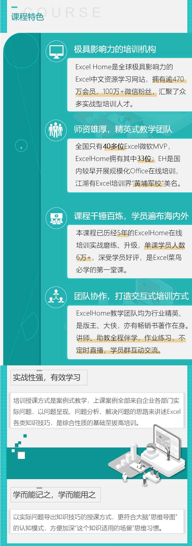 高含金量的教学体系,高配版的讲师、助教团队可以让您反复的学,技巧的学,想学不会都难,高效的学习效果,更能为您节省9成的培训费用,从小白到高手,只需30天,让Excel水平飞起来。