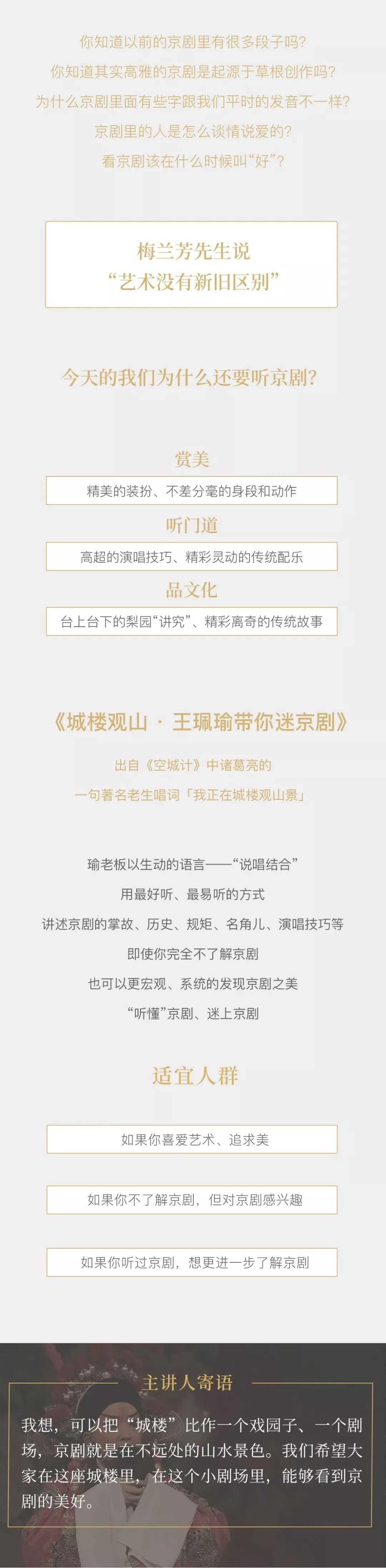瑜老板以生动的语言——“说唱结合”,用最好听、最易听的方式,讲述京剧的掌故、历史、规矩、名角儿、演唱技巧等。即使是完全不了解京剧的人,也可以更宏观、系统的发现京剧之美、“听懂”京剧、迷上京剧。