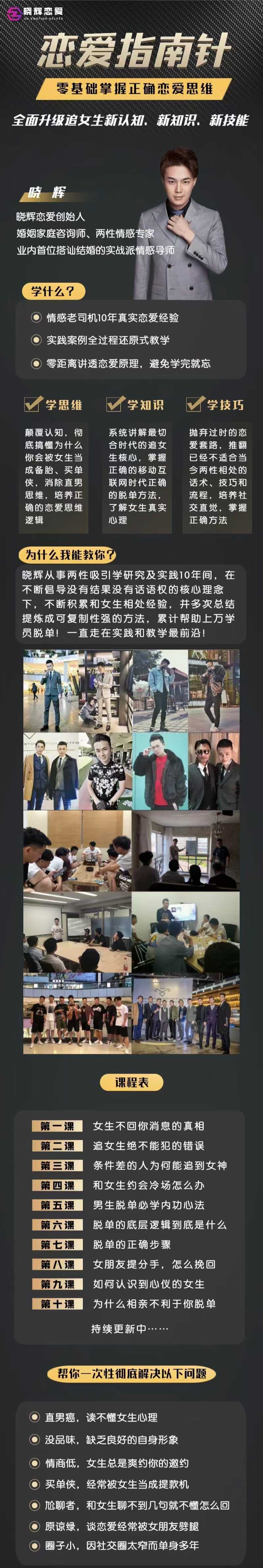 晓辉从事两性吸引学研究及实践10年间,在不断倡导没有结果没有话语权的核心理念下,不断积累和女生相处经验,并多次总结提炼成可复制性强的方法,累计帮助上万学员脱单!一直走在实践和教学最前沿!
