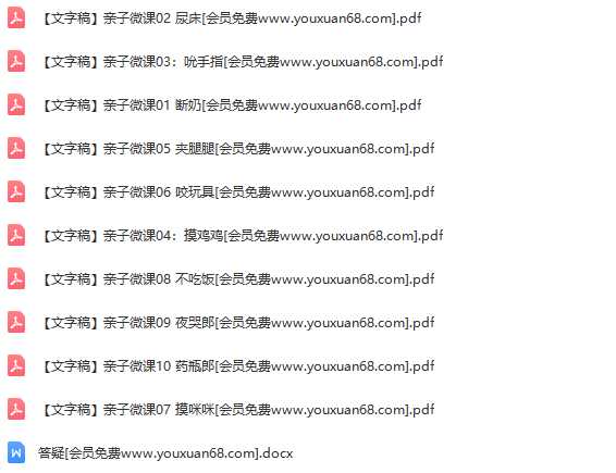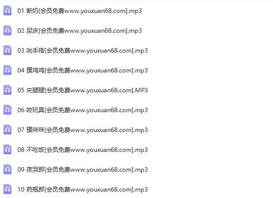 「 断奶 」「 尿床 」「 吮手指 」「 玩鸡鸡 」「 夹腿腿 」「 咬玩具 」「 摸咪咪 」「 不吃饭 」「 夜哭郎 」「 药瓶郎 」