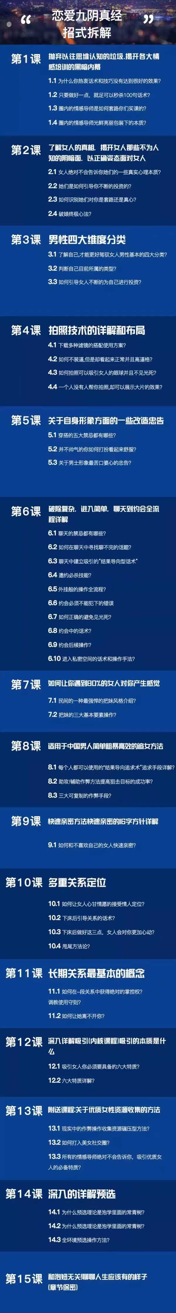 1三套内部核心高级网络课,分别是《恋爱九阴真经》、《私密课》、《心法》,所有的内容均是最保密,最干货,不是市场上那种营销课能比的,用则有效。