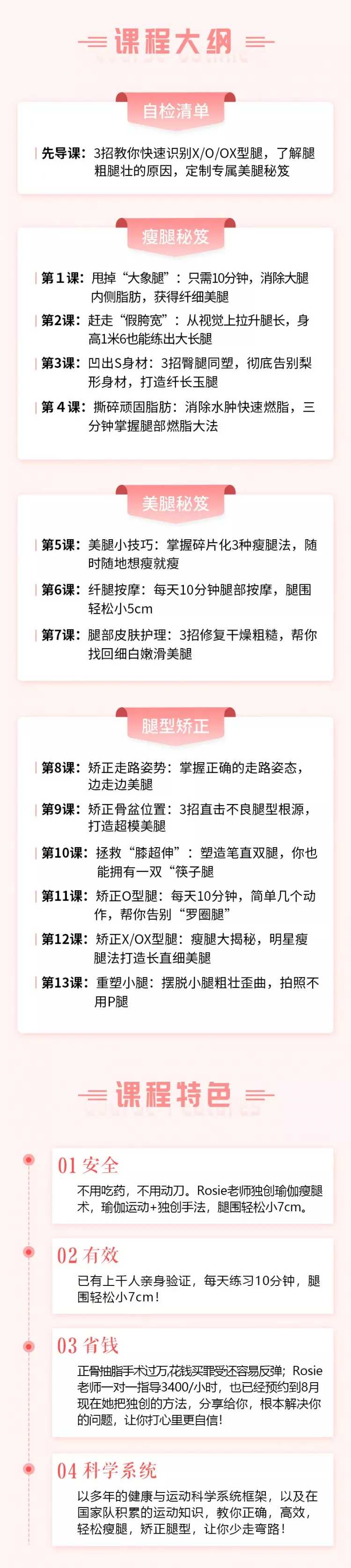 本课程的目标是教你如何安全高效瘦腿,矫正腿型。无论你是O、X\\OX腿形、膝超伸.假胯宽以及大腿松弛、小腿粗壮、双腿浮肿梨型身材等都能得到科学系统专业的指导。