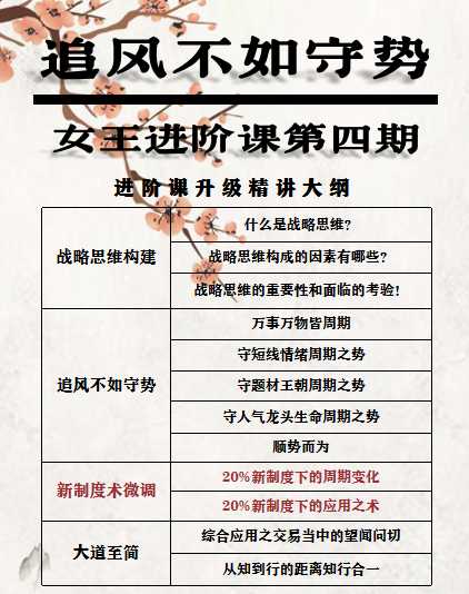 四期课程中,在原有女王道于术的基础上,进阶全面讲解20%基础制度的术微调和周期变化的地方,执行标准是什么,为未来注册制的全面实行做好一切充足的准备。