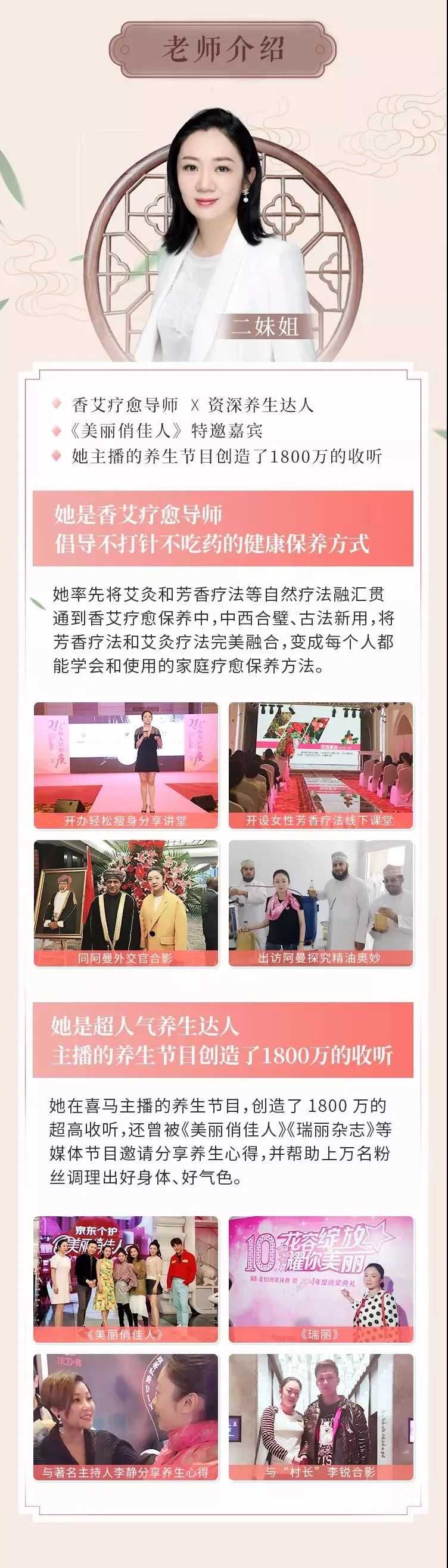下面分享的就是千聊二妹姐播讲的艾灸养生冻龄课程。不跑美容院,不花冤枉钱,让你“艾”出不老颜、好气色、好身体。