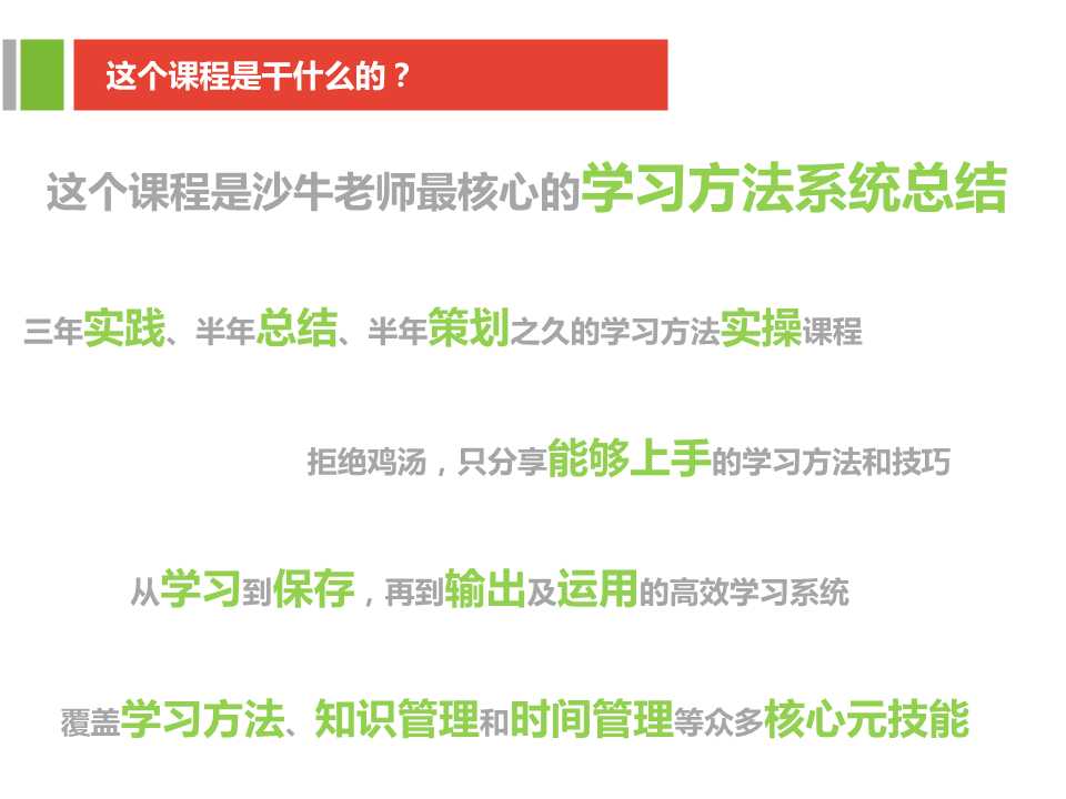 这个课程是沙牛老师最核心的学习方法系统总结,汇集了三年实践,半年总结,半年策划之久的学习方法实操课。拒绝鸡汤,只分享能够上手的学习方法和技巧, 从学习到保存,再到输出及运用的高效学习系统。覆盖学习方法,知识管理和时间管理等众多的核心元技能,带着你蜕变为学神,实现 爆发式成长。