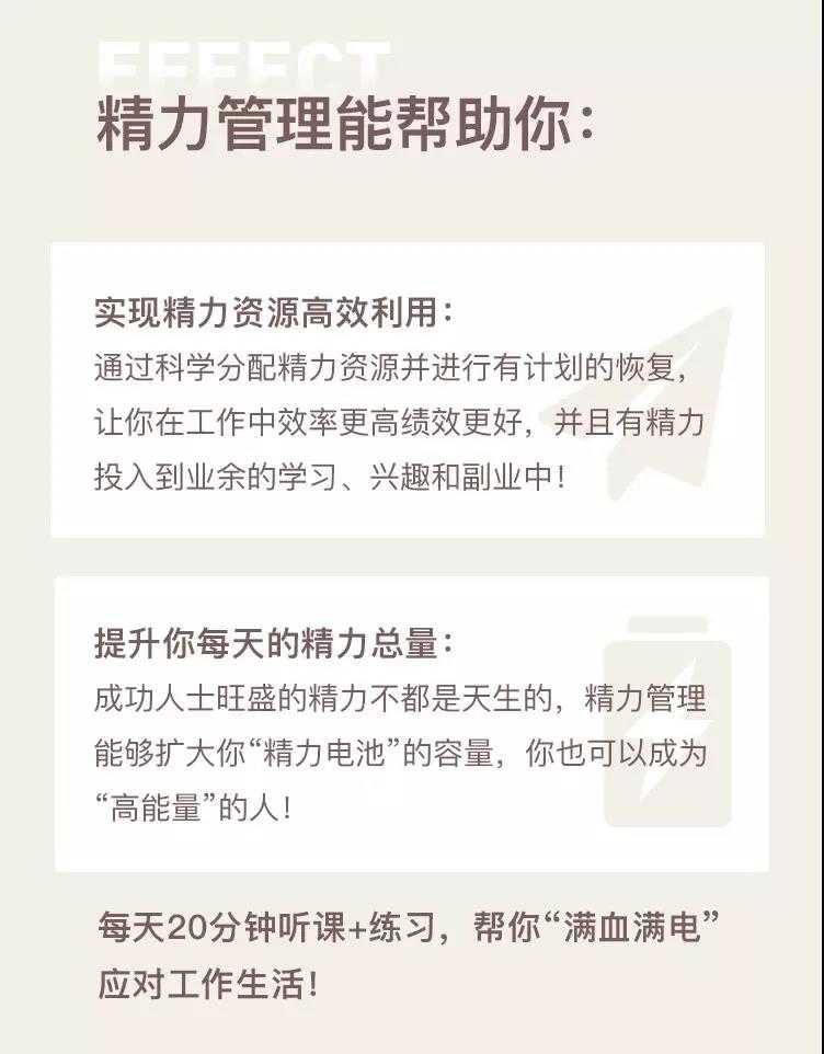 精力就像人体的电量,有的人可以充电 5 分钟工作两小时,有的人却恰恰相反。精力管理是对你电量的科学使用和合理恢复,并且给你的电池扩容,让你在有限的时间里做更多的事。
