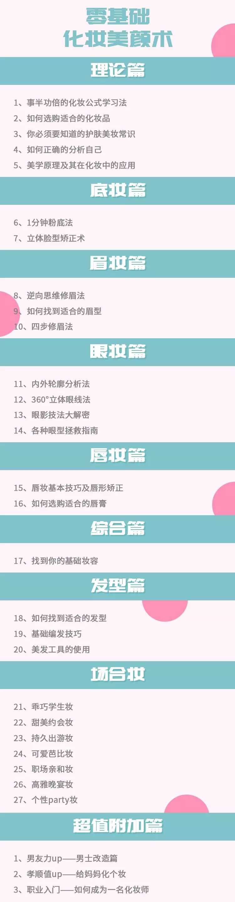 本系列课程共 30节视频大课,基础理论+实操讲解,从多角度多场景入手,满足你绝大部分妆容需求!