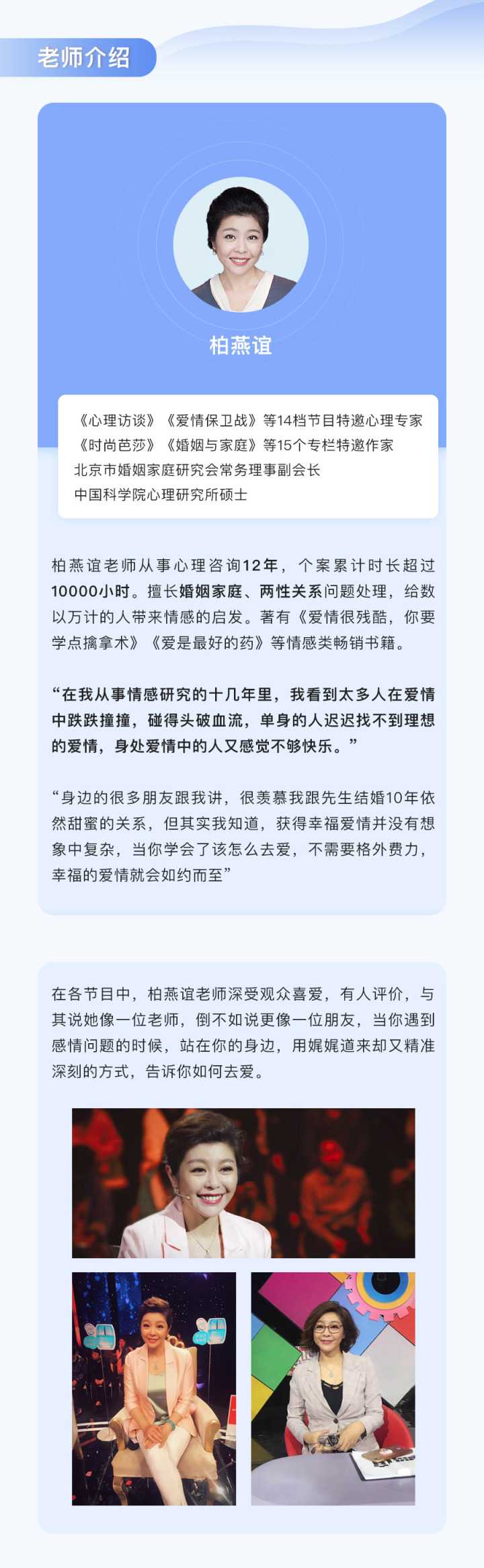 这次,壹心理特别邀请《爱情保卫战》的心理专家、从事心理咨询12年的柏燕谊老师,她将把帮助上万人理清情感问题的经验,结合自身经营10年幸福爱情的心得,浓缩到《30堂爱情必修课,做个被宠爱的聪明女人 》一课中。