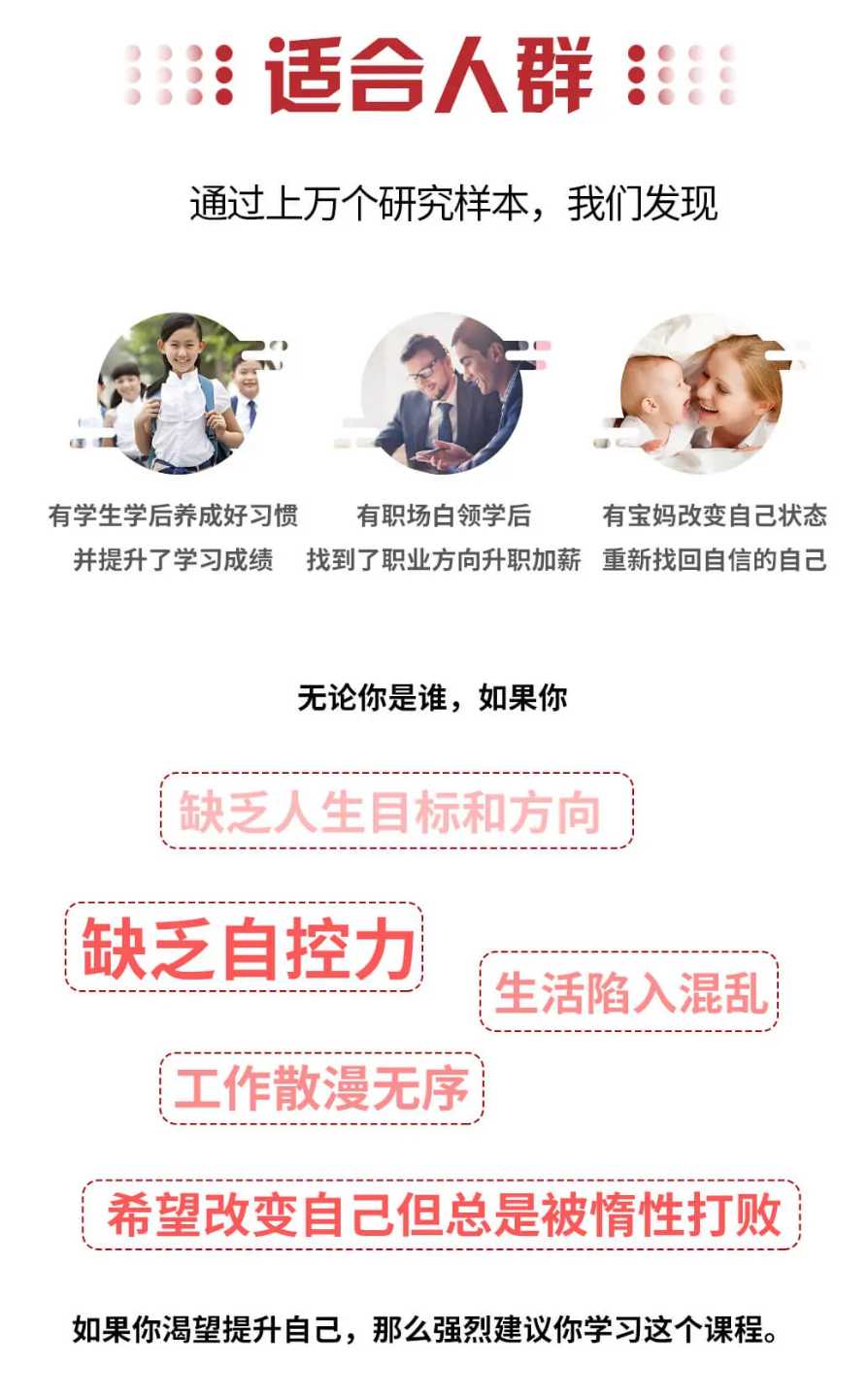30天引爆自律力课程首次提出「自律五大系统」,3大板块+30节超值干货,从用户的痛点出发,更加科学化的从认知、思维、行动、习惯、行为设计、终身成长等角度,超实用自律方法和策略帮你养成自律。