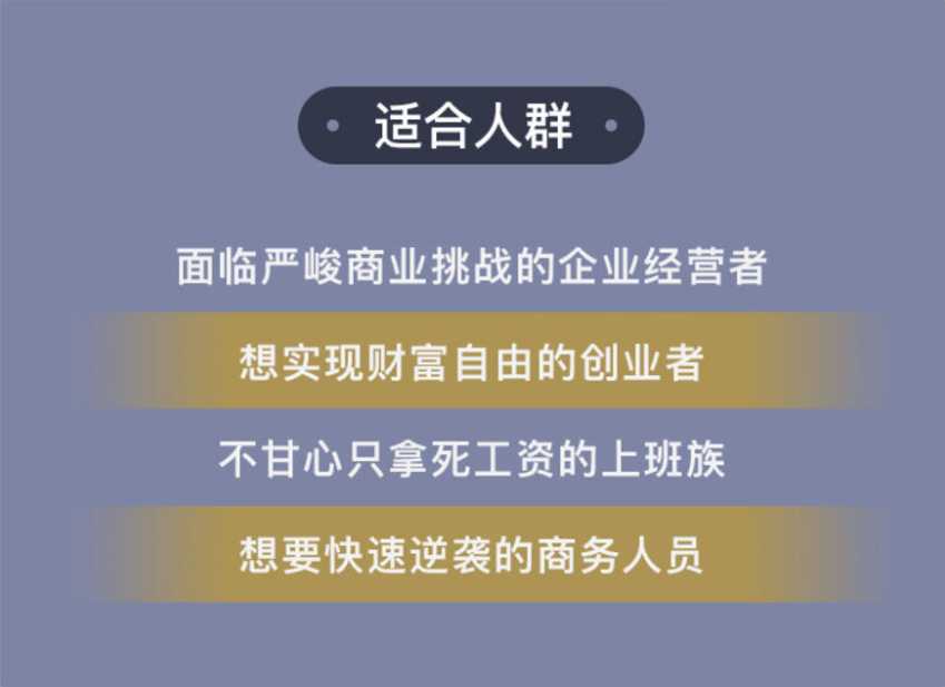 不管你是创业者,还是苦逼上班族,只要你想实现财富自由,实现阶层跨越,在激烈的社会竞争中抢占先机,那么绝对不能错过这门课程!