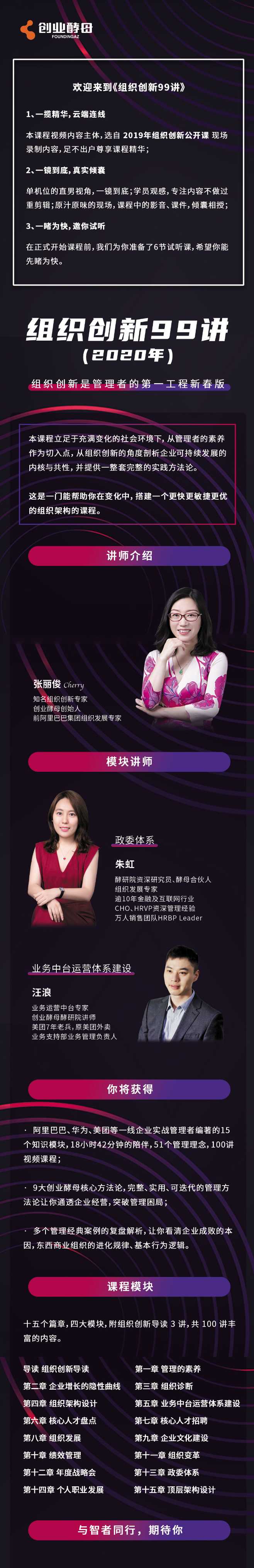 本课程立足于充满变化的社会环境下,从管理者的素养作为切入点,从组织创新的角度剖析企业可持续发展的内核与共性,并提供一整套完整的实践方法论。
