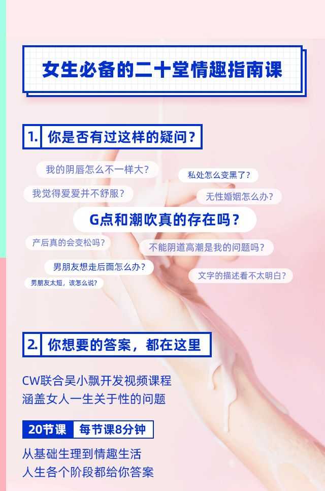 CW联合吴小飘开发视频课程《女性必备的20堂情趣指南课》涵盖女人一生关于性的问题,从基础生理到情趣生活人生各个阶段都给你答案