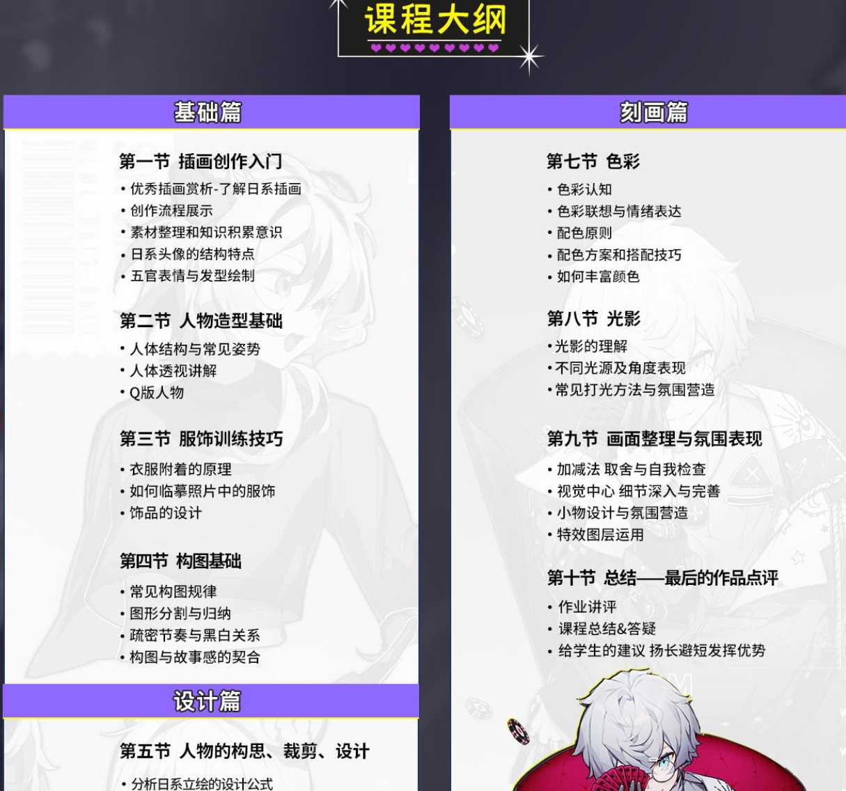 该课程为日系插画人物设计班,内容涵盖日系头像、人物造型、服饰设计、构图基础、人物构思/裁剪/设计、背景绘制、色彩光影、小物设计、氛围营造等内容。主题设计流程讲解、高级日系平涂质感、特色装饰性元素组合,快来和梦野黑甜大大一起,学习个性又漂亮的日系插画人物设计!