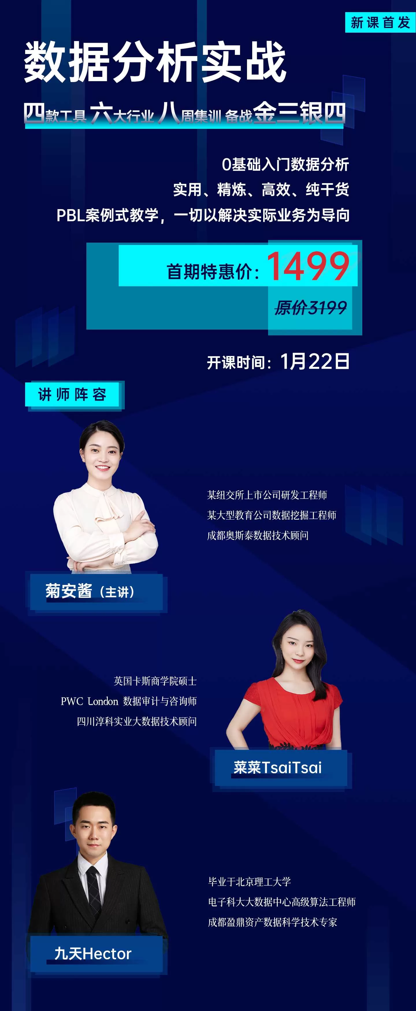 课程由菊安酱(主讲)、菜菜、九天老师共同打造的2021数据分析实战官网售价1279元。课程内容包括数据分析思维、工具、数据分析技能、数据分析行等共11个章节: