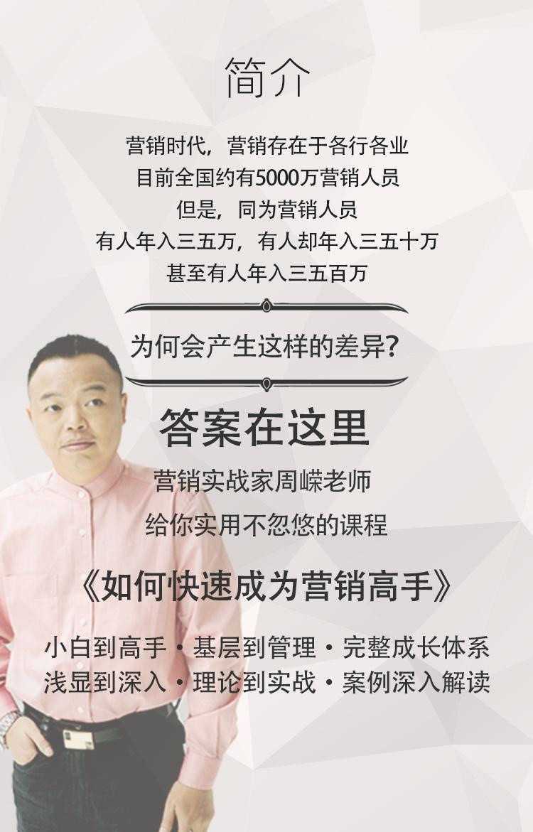 周嵘,中国营销学会副会长,互联网+整合营销学院创始人,首次将他总结和打磨了十几年的营销者实战成长攻略,通过音频课程倾囊相授!
