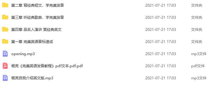 杨亮老师:完美英语发音教程 共49章节 音频MP3、PDF,节目中不仅有教学音频,轻松的英语歌曲,庄严而多样化的名人演讲英语原声。帮助学习者通过不同的形式快速掌握英语,提高听说能力。 中国著名英语培训师,对外英语教学(TESOL)美国教育部认证高级教师、英文配音员;法国空客集团(Airbus Group)中国区英语培训师;2008年北京奥运会、残奥会志愿者英语培训师。