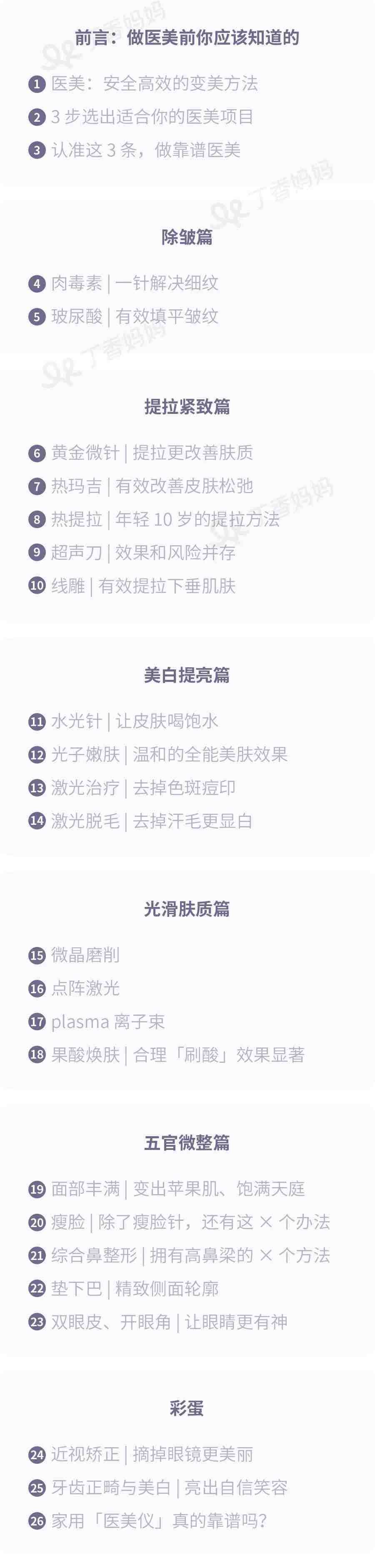 李医生会根据大家的需求,比如:美白、祛斑、除皱、祛眼袋痘印痘坑等,详细讲解 20 个常见的医美项目。