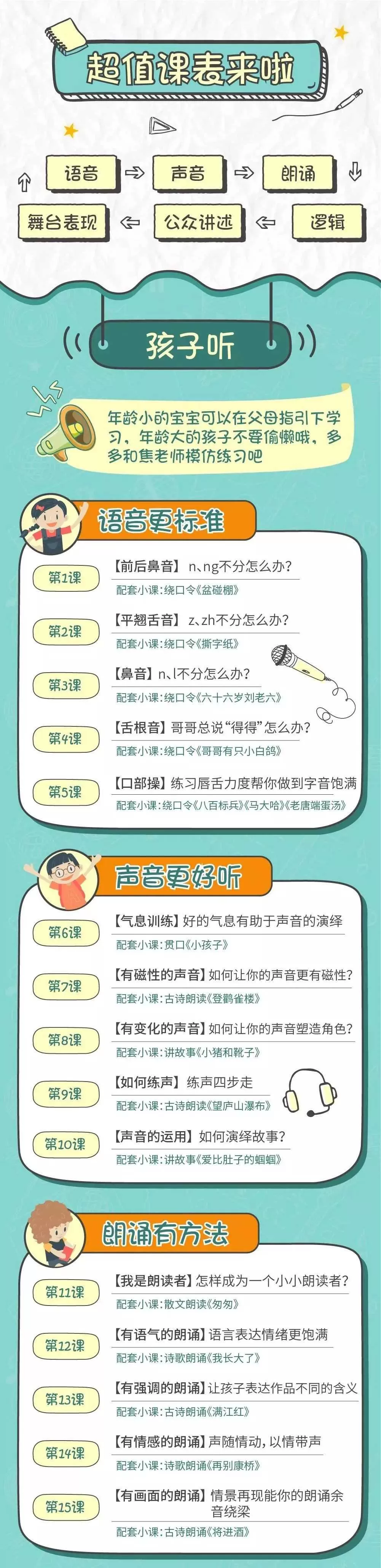 从语音、声音、朗诵、舞台表现、公众讲述、逻辑 6大模块,帮您教出敢说、爱说、自信说的孩子!