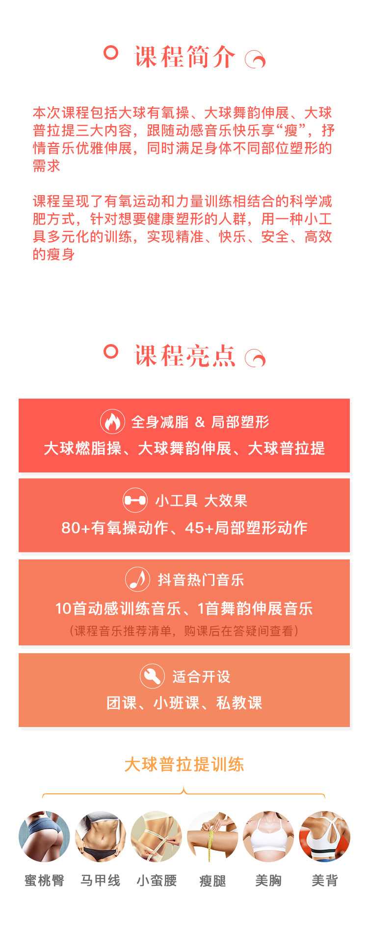 本次课程包括大球有氧操、大球舞韵伸展、大球普拉提三大内容,跟随动感音乐快乐享“瘦”,抒情音乐优雅伸展,同时满足身体不同部位塑形的需求