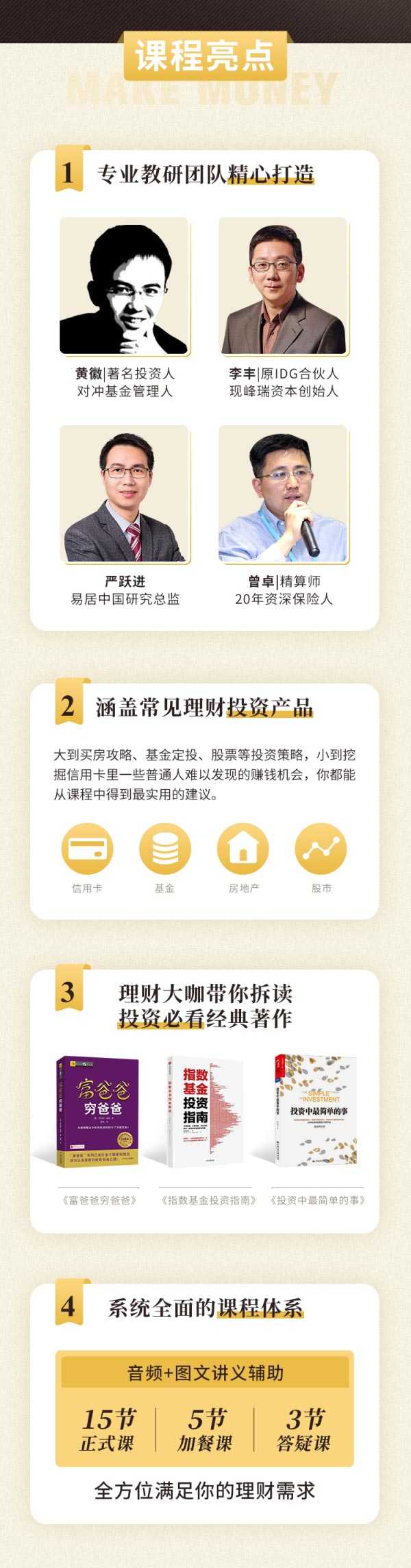 本课程《吴晓波力荐:左志坚-15节小白理财实战课,帮你抓住更多赚钱机会》课程体系系统全面,音频+图文讲义辅助,15节正式课,5节加餐课,3节答疑课,全方位满足你的理财需求