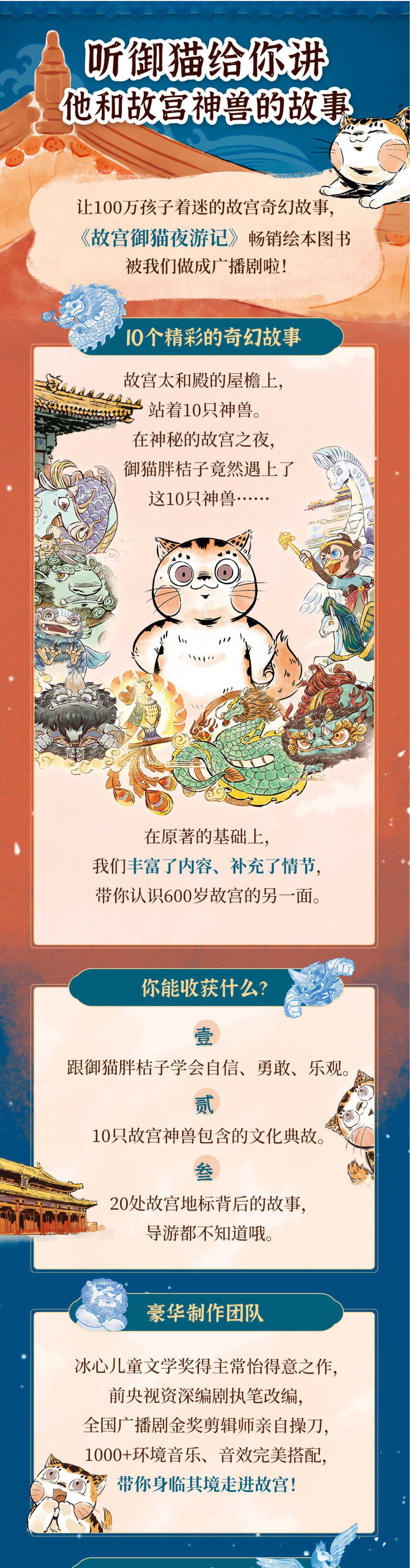 让100万孩子着迷的故宫奇幻故事,《故宫御猫夜游记》畅销绘本图书,被少年得到做成广播剧啦!10个精彩的奇幻故事,故宫太和殿的故宫之夜,御猫胖桔子竟然遇上了这10只神兽.……..