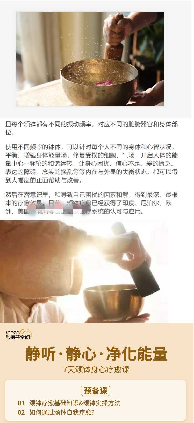 5、平衡脉轮能量:每堂课都对应着每个脉轮,不同的钵体音乐,激活不同脉轮能量,达到脉轮平衡,自我疗愈。