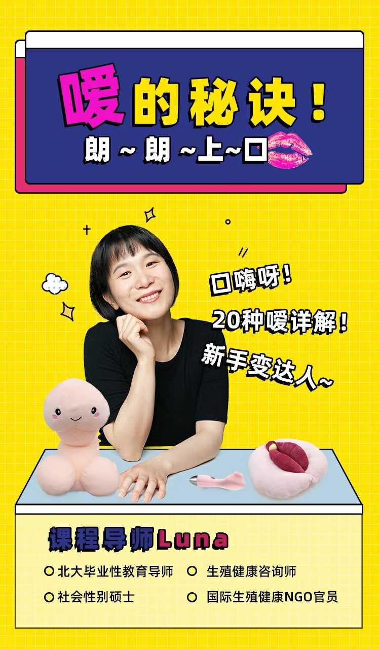 Luna《嗳的秘诀,25种玩法》导师: Luna 10年x教育工作,在生植健康NGO。本课程会有知识、理念、技术和健康的全方位培训生理、观念、实战三级进阶,分解20多种动作组合,再演示推荐的流程理解节奏感。新手可以借助水果,随着课程进行练习理解。