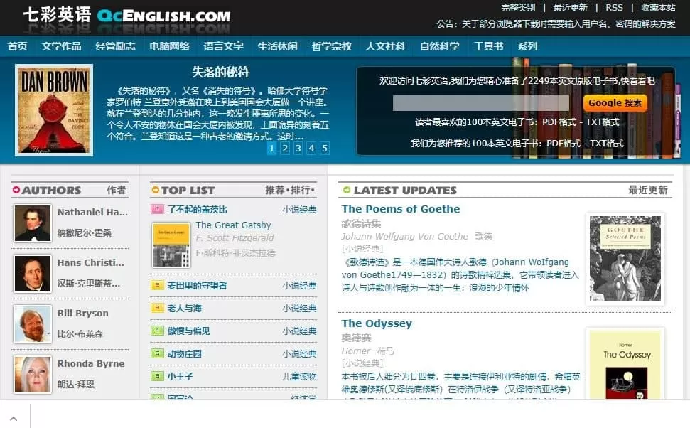 七彩英语全站电子书3750册 PDF TXT 格式,文学和工具书为主