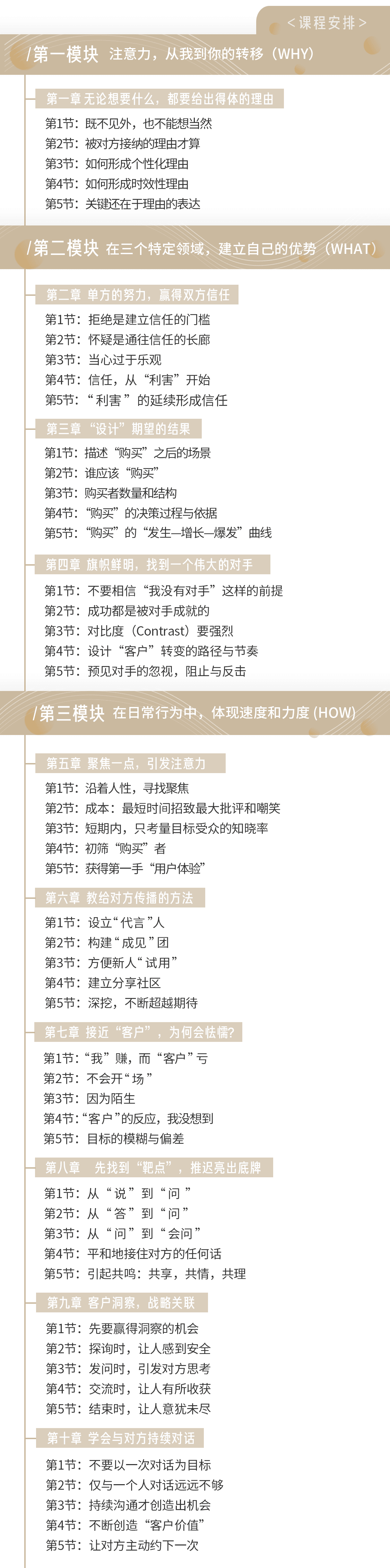 经过反复沟通,我们为你请来知名销售专家仲崇玉老师,将他24年实战销售经验浓缩为3大模块、10个课题,通过50次课程带你系统构建内在的销售思维体系,让你获得这些能力