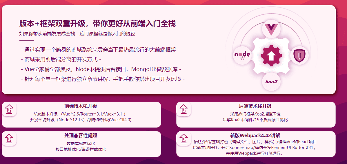课程介绍A000047: 本课程前后端兼顾,用Vue.js、Node.js、Koa、ES6等…