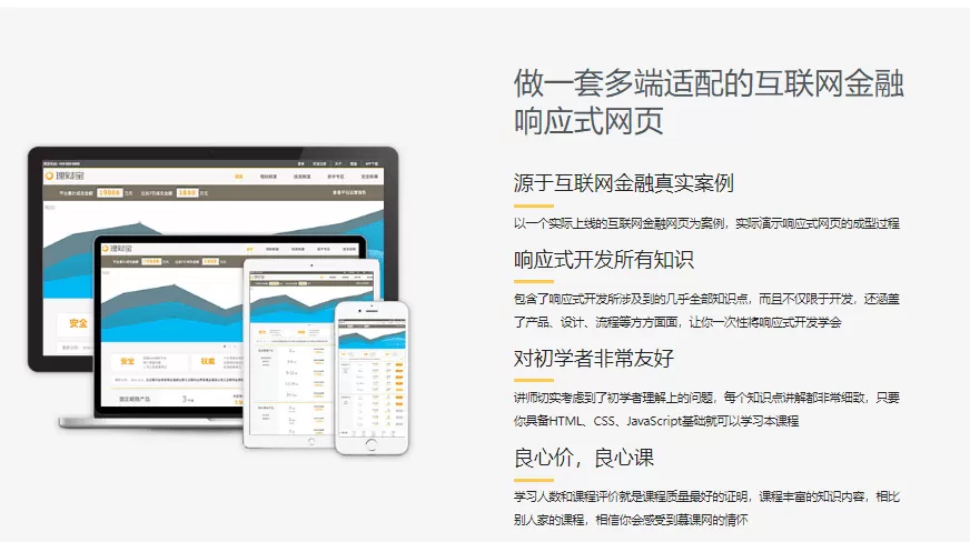 为具备HTML、CSS、JavaScript基础、对响应式设计和开发有兴趣的同学打造,是一门学习响应式网页开发的实战视频教程,本视频教程将带从实战出发,做一套多端适配的互联网金融响应式网页,通过本视频教程学习,你将学会响应式开发所涉及到的几乎全部知识点,还涵盖了产品、设计、流程等方方面面,让你一次性将响应式开发学会。本视频教程资源目录在底部。
