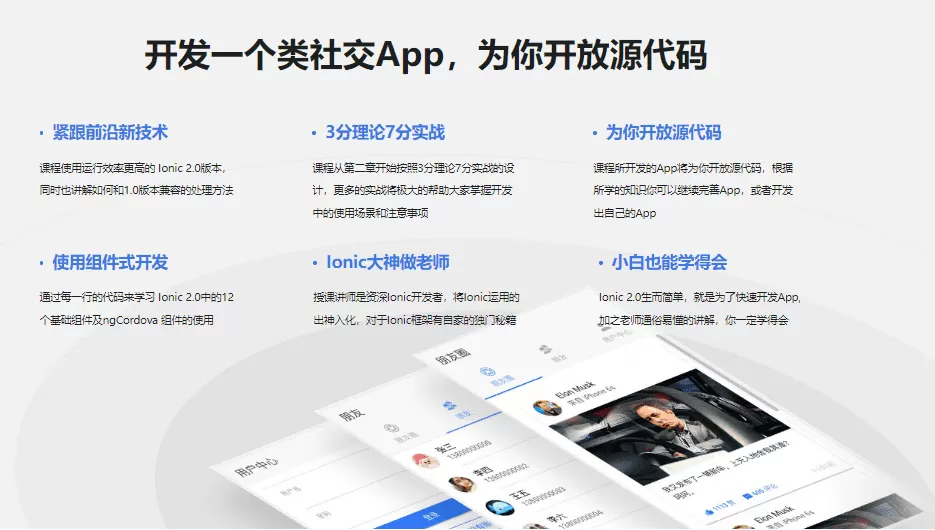 - 着重介绍 Ionic 中经常使用到的组件,课程主要采用3分讲解组件概念,7分使用实际案例来带领大家一起通过代码实现组件的学习过程,并为后期的项目实现打下基础。