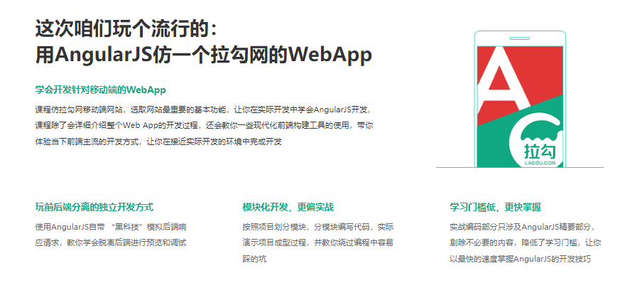 课程介绍(A000019): 基于AngularJS,仿拉勾网开发一个招聘类的移动端单页应用…