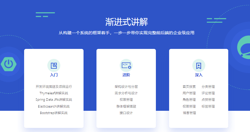 带你围绕Spring Boot技术栈,所涉及的技术不仅限于某个领域,以整合多个技术点,搭建一个能够用于快速开发的框架,一步一步构建博客系统的各个功能,实现一个完整前后端的企业级Java应用。