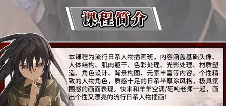 本课程为流行日系人物插画班,内容涵盖基础头像、人体结构、肌肉躯干、色彩处理、光影处理、材质塑造、角色设计、背景构图、元素丰富等内容。个性精致的人物角色,质感十足的日系半厚涂风格,极具氛围感的画面表现。快来和羊羊空调/砸吨老师一起,画出个性又漂亮的流行日系人物插画!