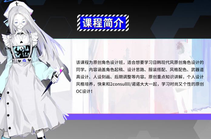 该课程为原创角色设计班,适合想要学习日韩现代风原创角色设计的同学。内容涵盖角色起稿、设计思路、服装搭配、风格配色、武器道具设计、人设刻画、后期调整等内容。原创重点知识讲解,个人设计风格培养,快来和2consullII/诺诺大大一起,学习时尚又个性的原创OC设计!