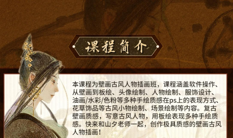 本课程为壁画古风人物插画班,课程涵盖软件操作、从壁画到板绘、头像绘制、人物绘制、服饰设计、油画/水彩/色粉等多种手绘质感在ps上的表现方式、花草饰品等古风小物绘制、场景绘制等内容。复古壁画质感,写意古风人物,用板绘表现多种手绘质感。快来和山夕老师一起,创作极具质感的壁画古风人物插画!