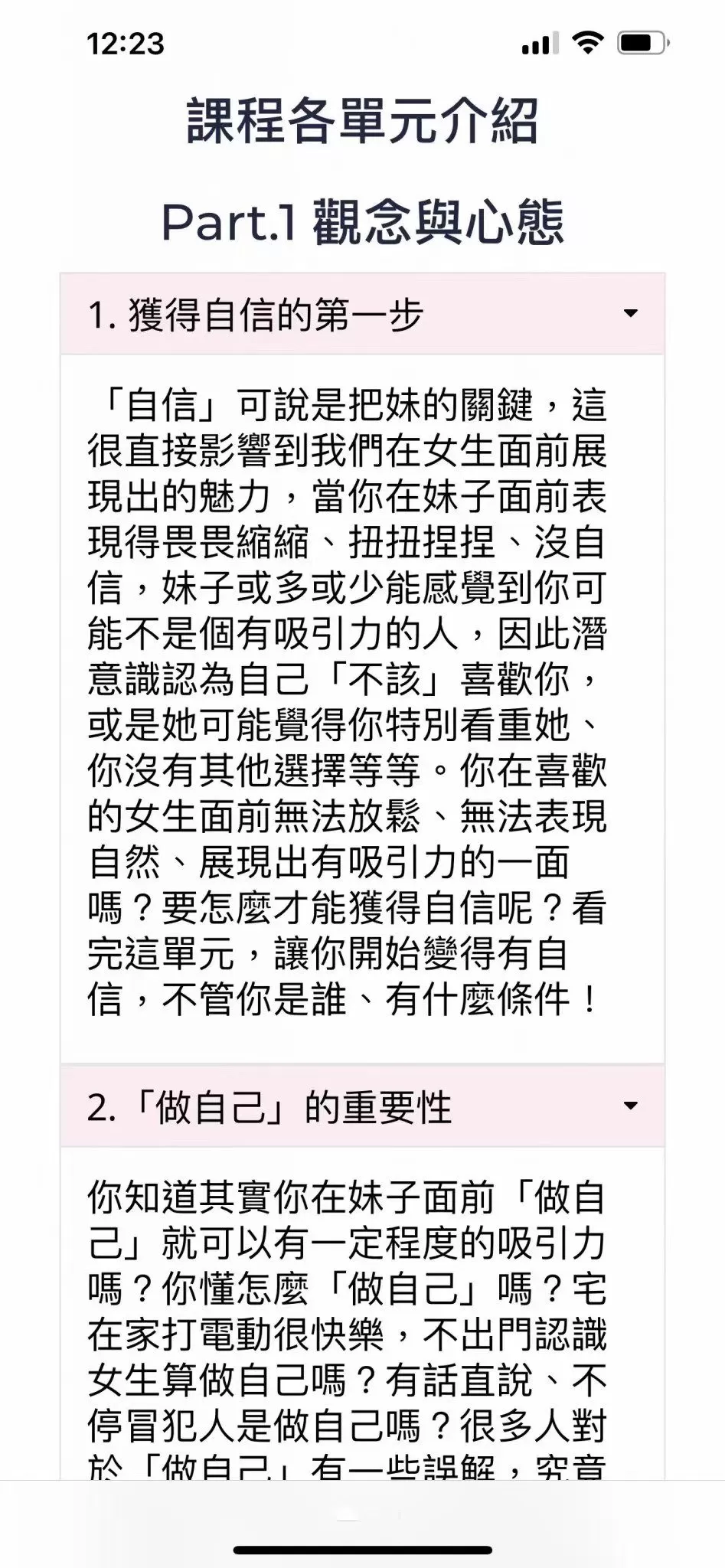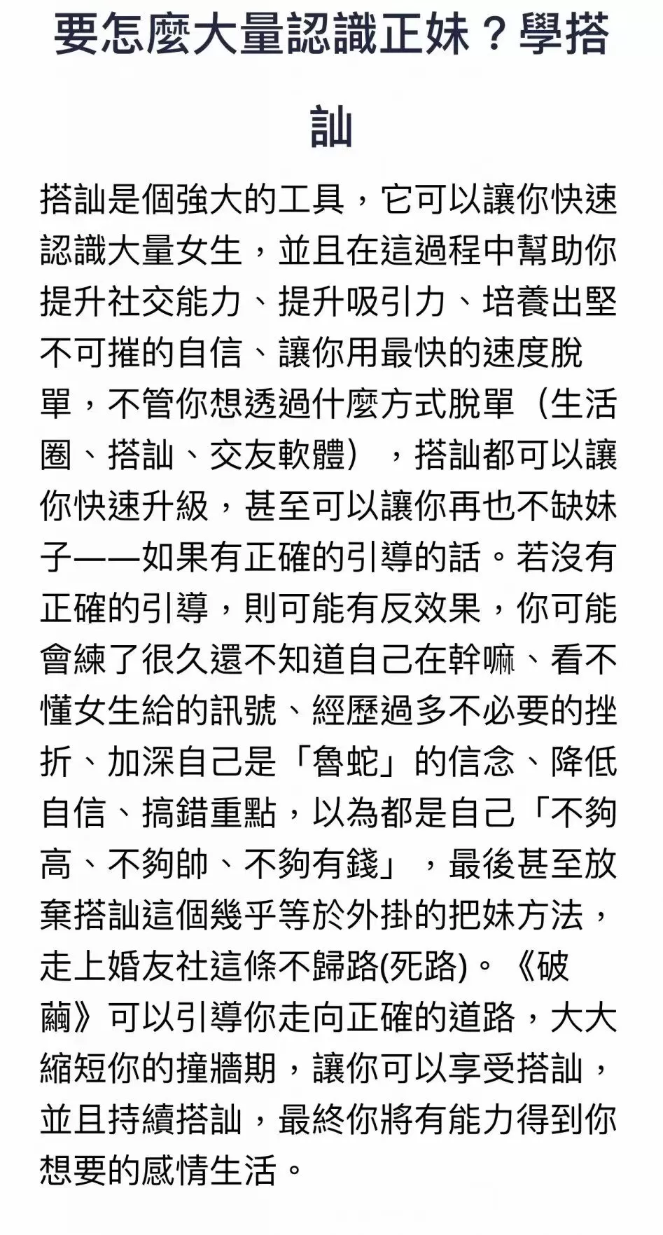 又一套台课,帮助你培养强大的自信,提升魅力,让妹子对你“有感觉”。不再没有认识妹的管道、不再缺妹、不再为没有妹烦恼,搭讪、约会不再为“聊什麽”苦恼。
